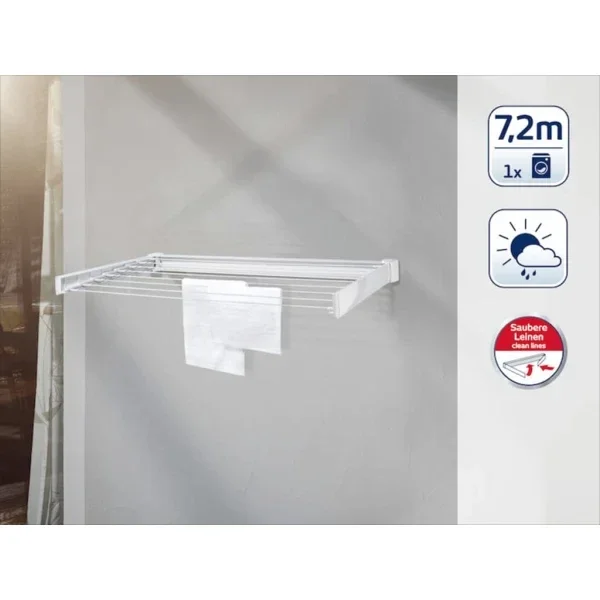 Dit wanddroogrek heeft acht droogstaven van in totaal ongeveer 7,2 meter drooglengte. Dankzij het volledig gesloten ontwerp zijn de droogstaven beschermd tegen vuil en regen wanneer ze buiten worden geïnstalleerd. Om het te openen, vouwt u eenvoudig de twee vleugels uit en de stevige, gepoedercoate droogstaven zijn klaar voor gebruik.