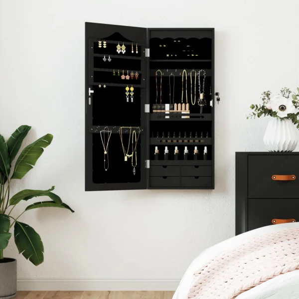 - Ruime opbergruimte: De opbergspiegel is voorzien van voldoende haken, hangers en planken om uw sieraden netjes geordend en binnen handbereik te houden.