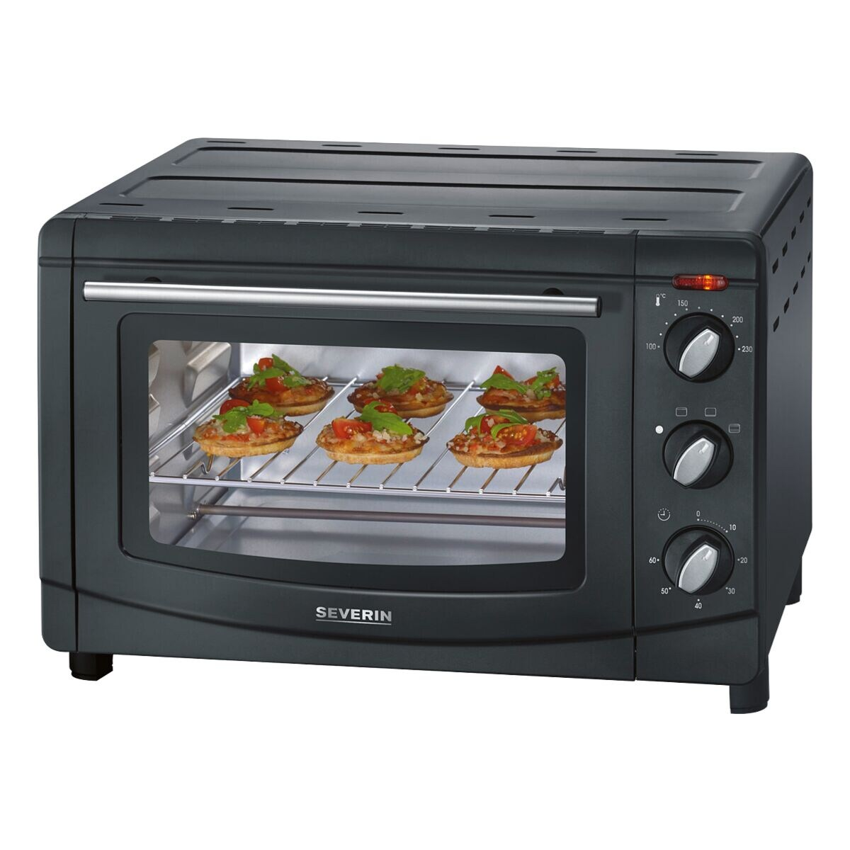 compacte tafeloven voor pizza / gebak / broodjes enz, boven- en onderwarmte (apart / gecombineerd), geschikt tot Ø 30 cm, 60-minutentimer met signaaltoon, veiligheidsstekker, vermogen: 1500 W, temperatuur: 100 °C - 230 °C, inhoud: 20 L, legniveaus: 4, snoerlengte: 97 cm, kleur: zwart, gewicht: 5,5 kg, afmetingen (B/D/H): 44,5 / 38,5 / 29,5 cm, leveringsomvang: bak- en toastoven, grillrooster, bakplaat en kruimellade, verwijderbare handgreep