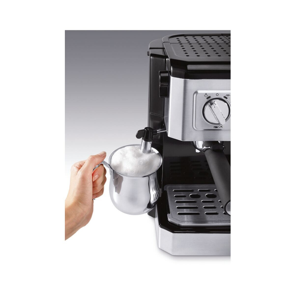 Combi-koffiemachine »BCO 421.S«, uitvoering: met koffie/pad accessoire en voor filterkoffie, watertank: 1 liter, max. capaciteit: 10 kopjes, met 2 filterinzetten voor 1 of 2 kopjes espresso, aan de voorzijde te bedienen, uitneembaar waterreservoir, dubbel waterfiltersysteem, melk opschuim-pijpje, te gebruiken met gemalen koffie (filterkoffie), espresso koffie en E.S.E. pad (accessoire), functies: afneembare druppelschaal, glazen kan, warmhoudplaatje, automatische uitschakeling, kleur: zwart, zilverkleur, met roestvrijstalen componenten, afmetingen (B/D/H): 37 / 30,5 / 32,5 cm