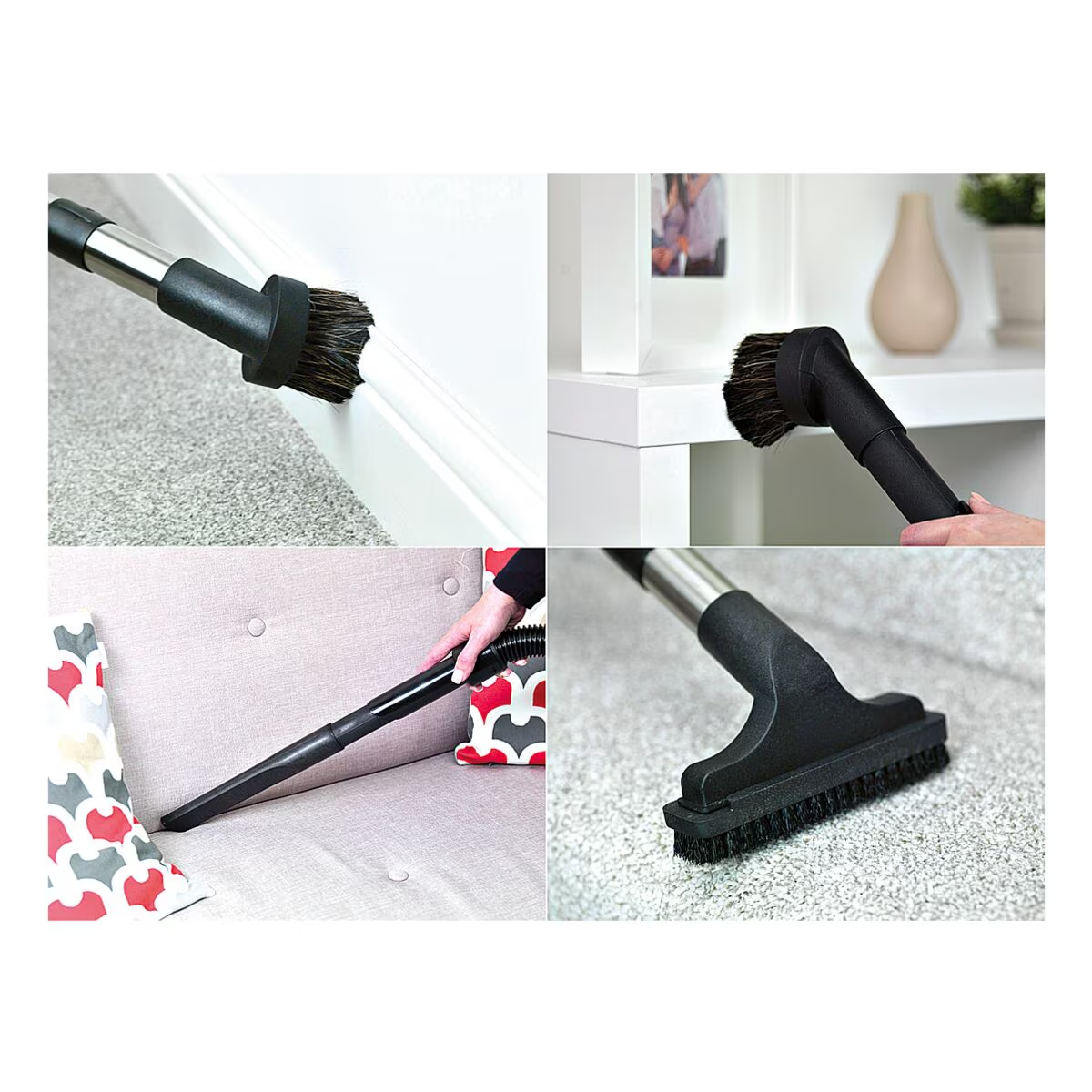 Stofzuiger »James JDS181-11«, langlevende, geluidsarme sterk presterende motor 620 W, luchtbewegingshoeveelheid: 31,5 liter/sec., onderdruk: 1950 mm WS, inhoud reservoir: 8 liter, snoerlengte: 10 m, met snoeropslag en parkeerfunctie met stanghouder, geluidsniveau 72 dB, energieverbruik: 25,2 kWh/jaar, gewicht: 7,6 kg, afmetingen (B/D/H): 340/340/340 mm, levering met set accessoires
