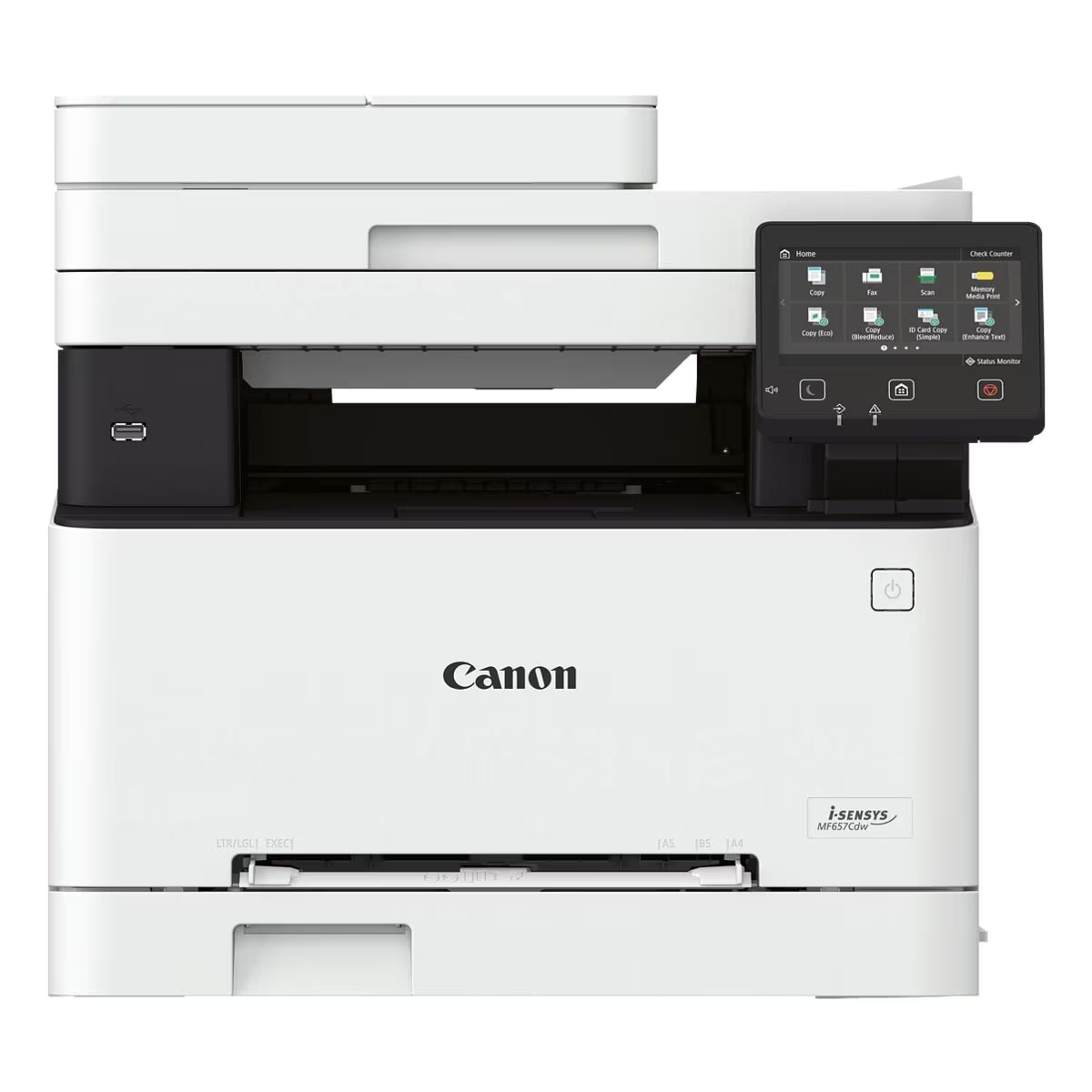 Multifunctionele printer »i-SENSYS MF657Cdw«, Kenmerken multifunctioneel apparaat: 4-in-1: printen, scannen, kopiëren & faxen, printtechnologie: laserprinten in kleur, schermtype: LCD-kleurenscherm / 12,7 cm, max. resolutie (Z/W/kleur): 1200 x 1200 dpi, afdruksnelheid (z/w/kleur): 21 / 21 pagina's/minuut, max. documentformaat: A4 printen / A4 scannen, papiercapaciteit: 250 bladen (80 g/m²), automatische documentinvoer (ADF) capaciteit: 50 bladen, dubbelzijdig printen: automatisch, mobiel printen: Apple AirPrint / Canon PRINT app / cloud services / Mopria / overige, scannertype: flatbed / ADFdubbelzijdig (in één doorgang), scannerresolutie: 600 x 600 dpi, netwerk: WLAN / LAN, gebruikersinterface: USB / WLAN / LAN, kleur: wit/zwart, afmetingen (B/D/H): 45,1/46/41,3 cm, massa (gewicht): 22,6 kg, meegeleverd worden: hoofdeenheid / startercartridges zwart voor ca. 1350 pagina's en cyaan/ magenta/ geel voor 680 pagina's
