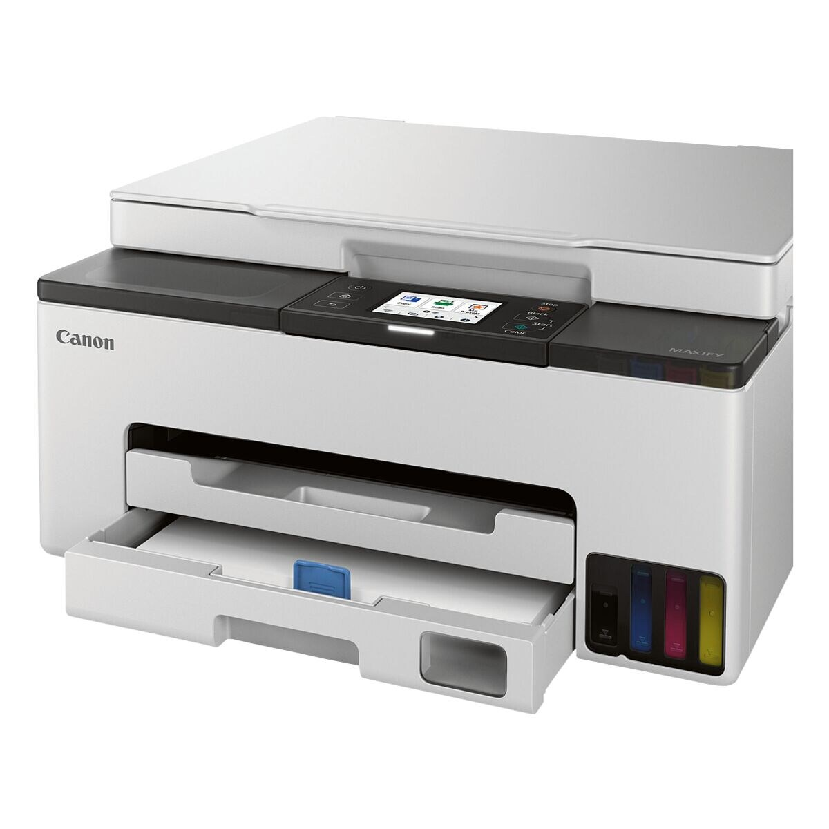 Multifunctionele printer »MAXIFY GX1050«, multifunctionele apparaatfuncties: 3-in-1: printen, scannen & kopiëren, printtechnologie: 2 printkoppen / hervulbare inkttanks, beeldschermtype: kleur LCD / touch screen / kantelbaar, max. resolutie (Z/W/kleur): 1200 x 600 dpi, printsnelheid (zwart-wit / kleur): 15 / 10 pagina's/minuut, max. documentformaat: A4 printen / A4 scannen, papiercapaciteit: 250 bladen (80 g/m²), dubbelzijdig printen: automatisch, mobiel printen: Canon PRINT app / Canon Cloud Printing / Apple AirPrint / WiFi Direct / Mopria, scannertype: flatbed kleurenscanner met CIS-sensor,scannerresolutie: 1200 x 2400 dpi,netwerk: WLAN / LAN, gebruikersinterface: USB Hi-Speed (Type B) / LAN / WLAN, kleur: wit / zwart, afmetingen, cm (B/D/H): 37.4/38/18.6, massa (gewicht): 7 kg, leveringsomvang: printer / 4 inktflessen (1x zwart en 1x elk C / M / Y) / netsnoer / beknopte handleiding en andere documentatie